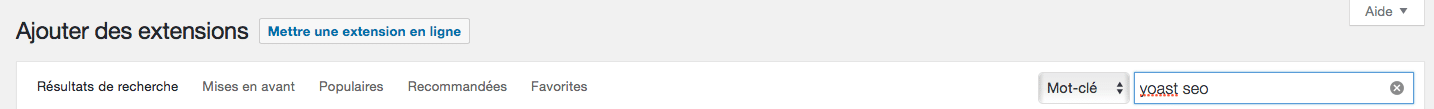 - Tapez « Yoast SEO » dans la barre de recherche en haut à droite.
